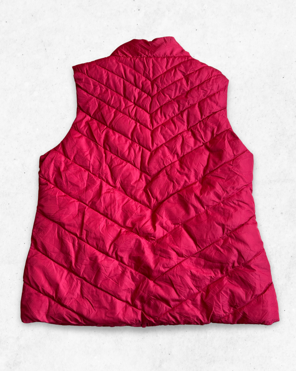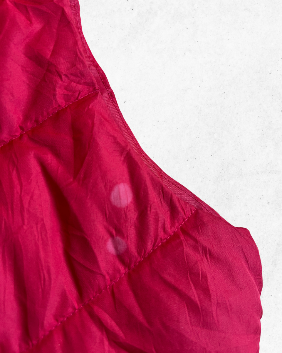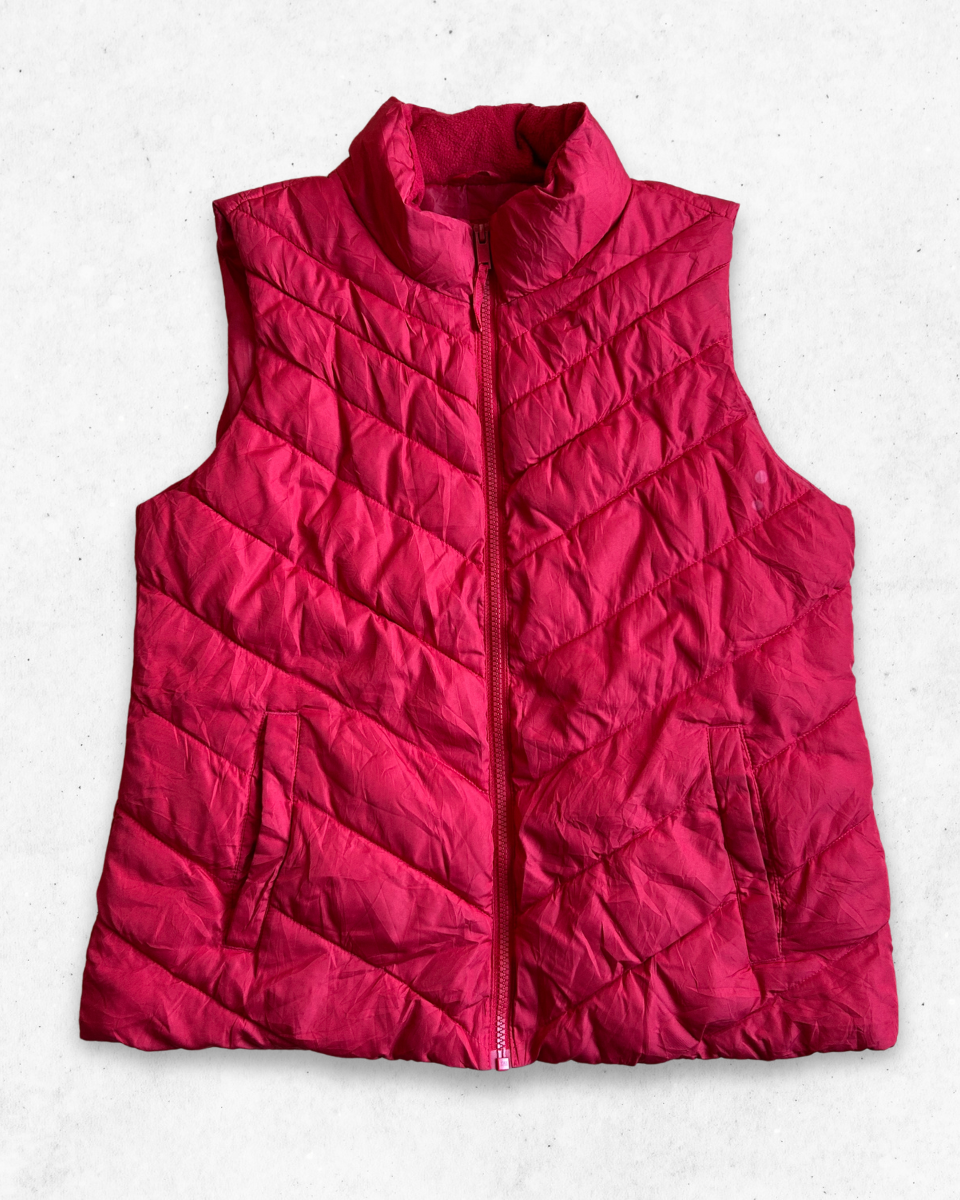 Chaqueta acolchada sin mangas para Mujer de la marca GAP, en color Rojo. En muy buen estado, como se puede apreciar en las fotos. Sin ningún desperfecto ni manchas reseñables, salvo dos leves manchas blancas en la parte delantera (Ver última foto).