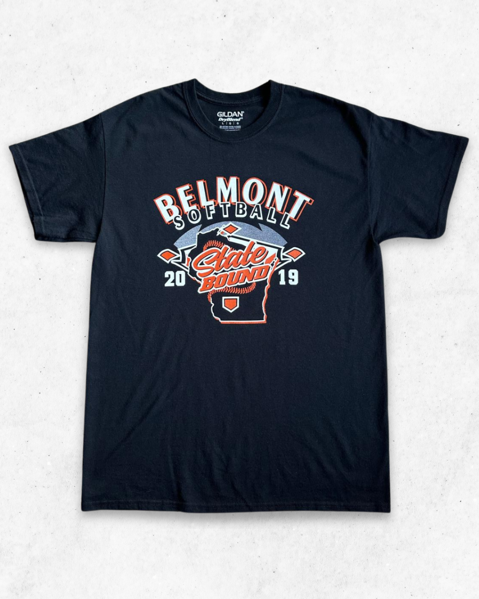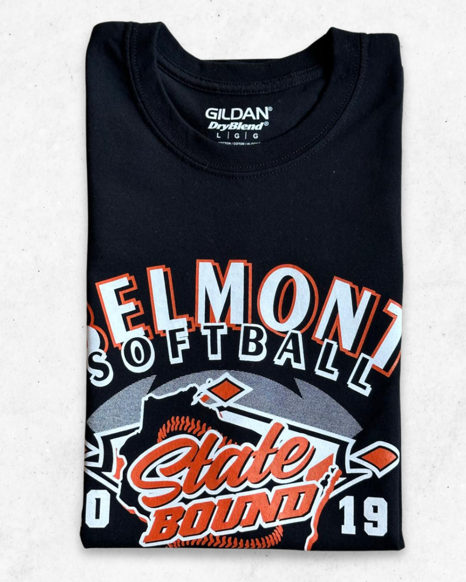 Camiseta Vintage Americana para Adulto del equipo de Softball, Belmont Braves, en color Negro. Marca Gildan. State Bound 2019.