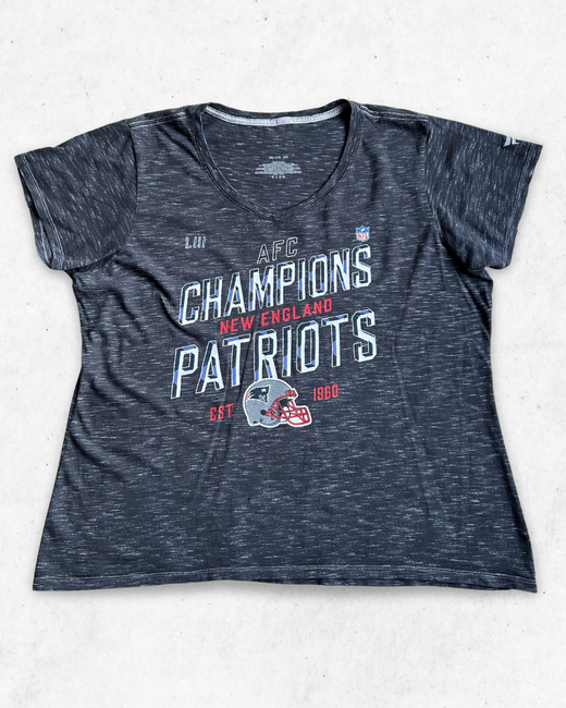 Camiseta para Mujer del equipo de la NFL, New England Patriots, en color Gris. Celebra a los New England Patriots como campeones de la AFC durante la temporada 2018, de cara al Super Bowl LIII. Marca Fanatics. En muy buen estado. Sin desperfectos ni manchas reseñables, salvo un pequeño agujero en la parte frontal, fácil de tratar (Ver fotos)