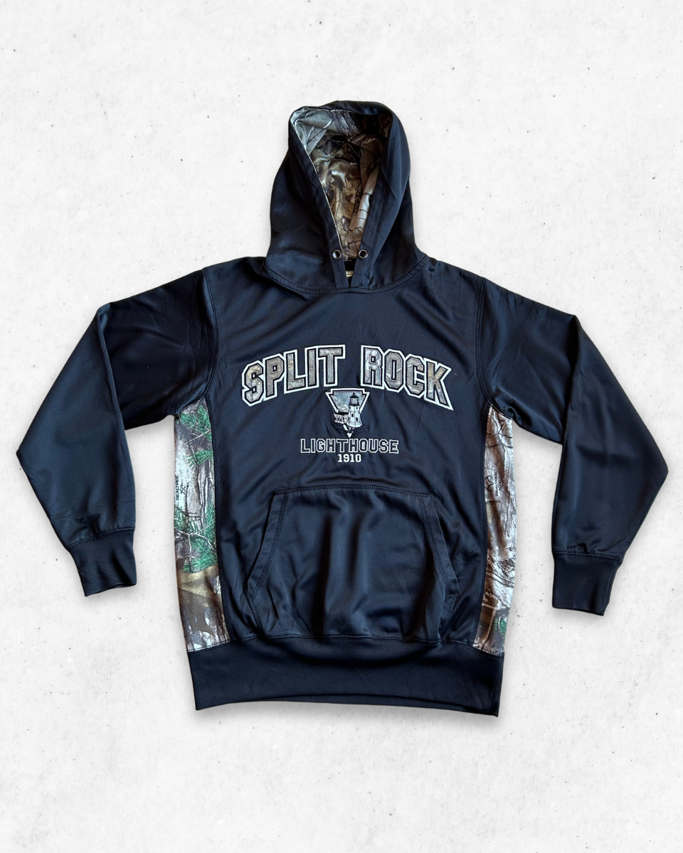 Sudadera con capucha Vintage americana para Adulto, que rinde homenaje al Faro de Split Rock (Split Rock Lighthouse), un lugar histórico icónico en Minnesota, Estados Unidos. Color Negro. No incluye la cuerda de la capucha.